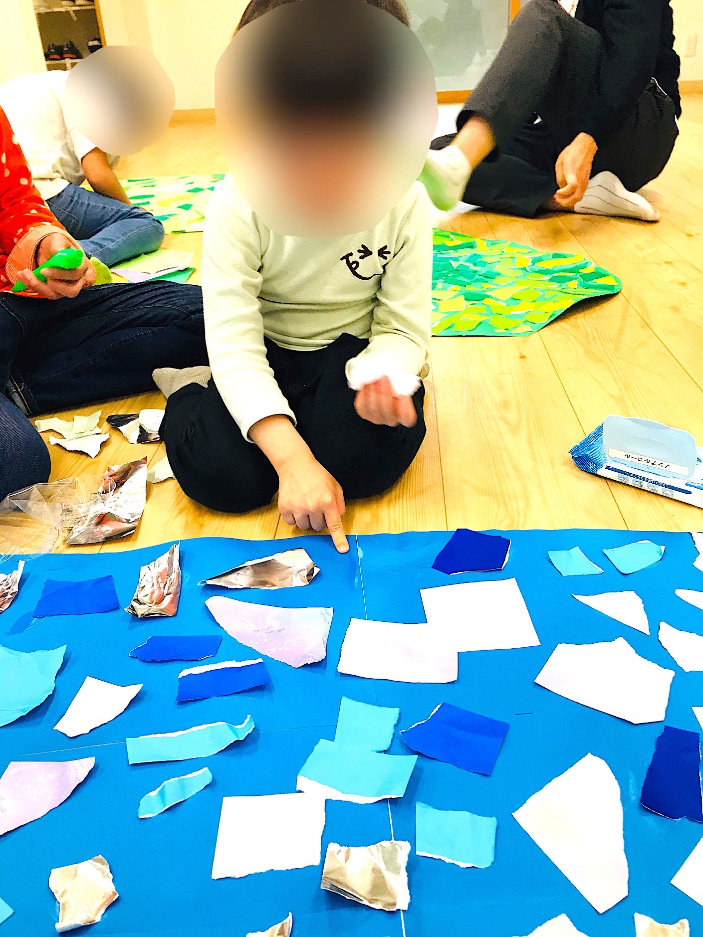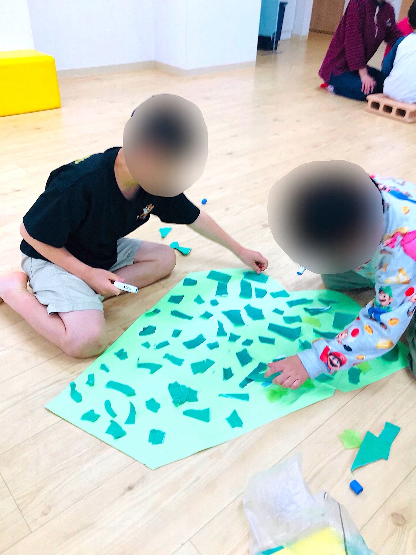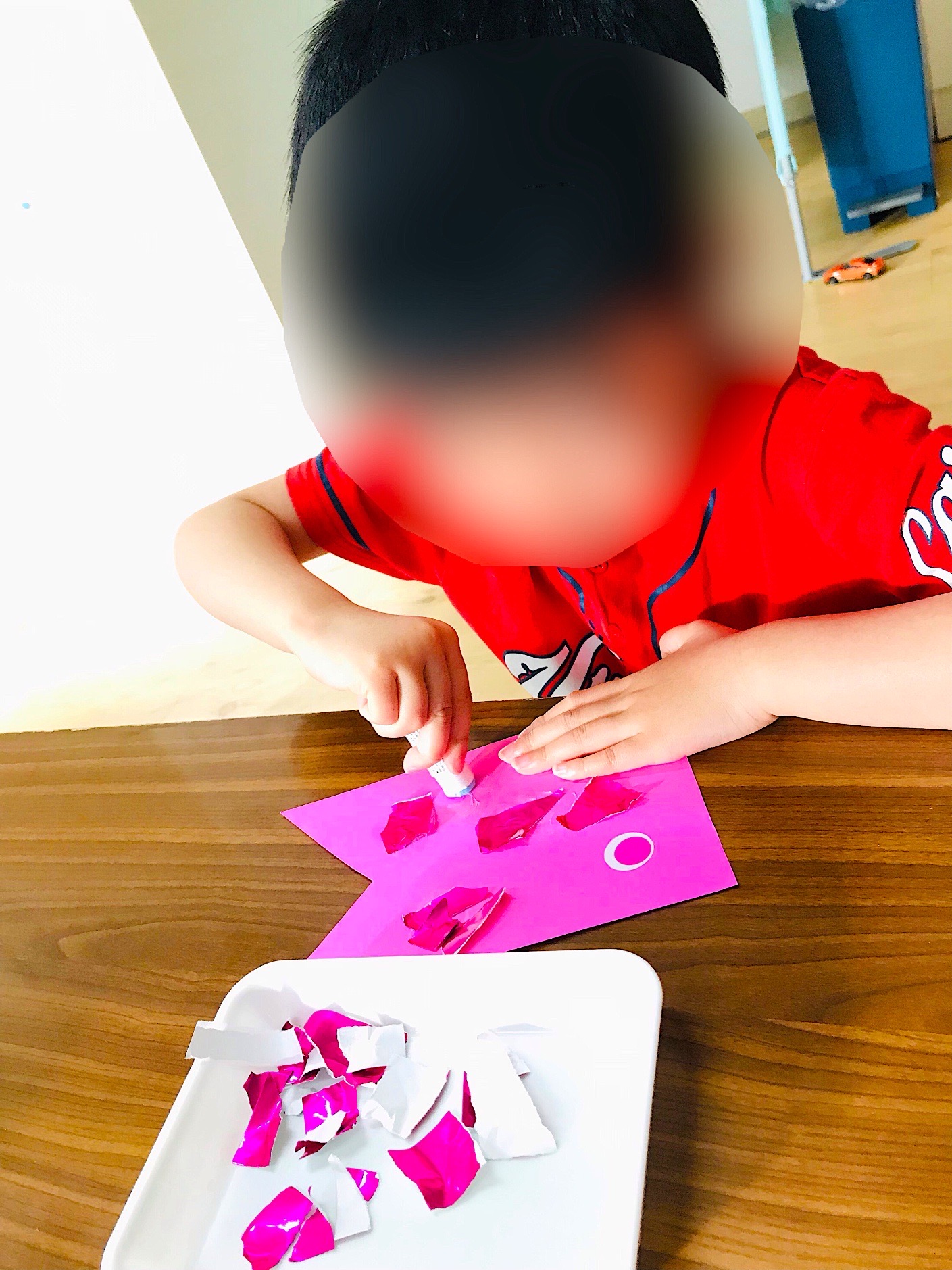 折り紙をちぎったり、細部まで糊を塗ったりと、