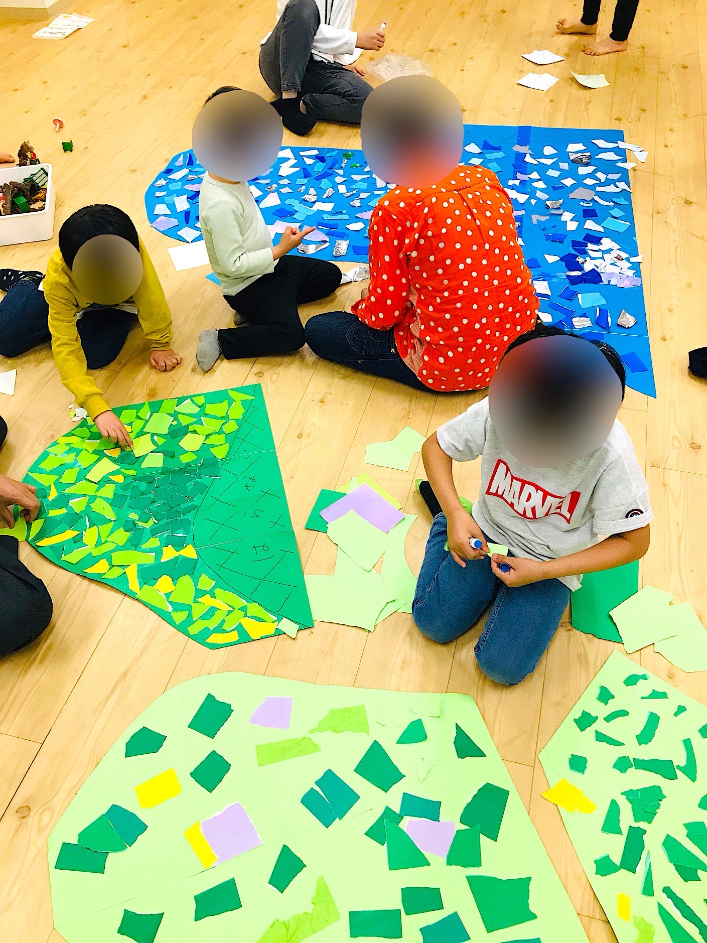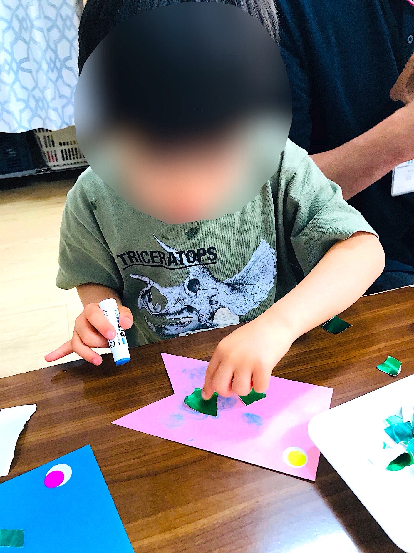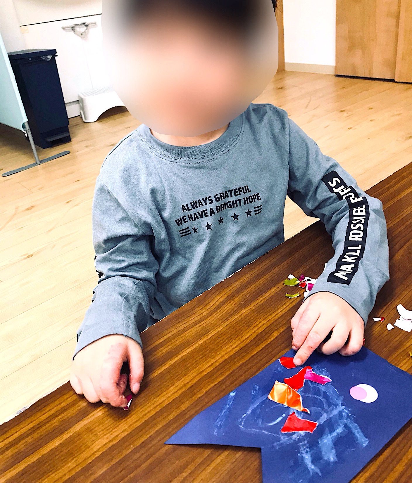 折り紙をちぎったり、細部まで糊を塗ったりと、