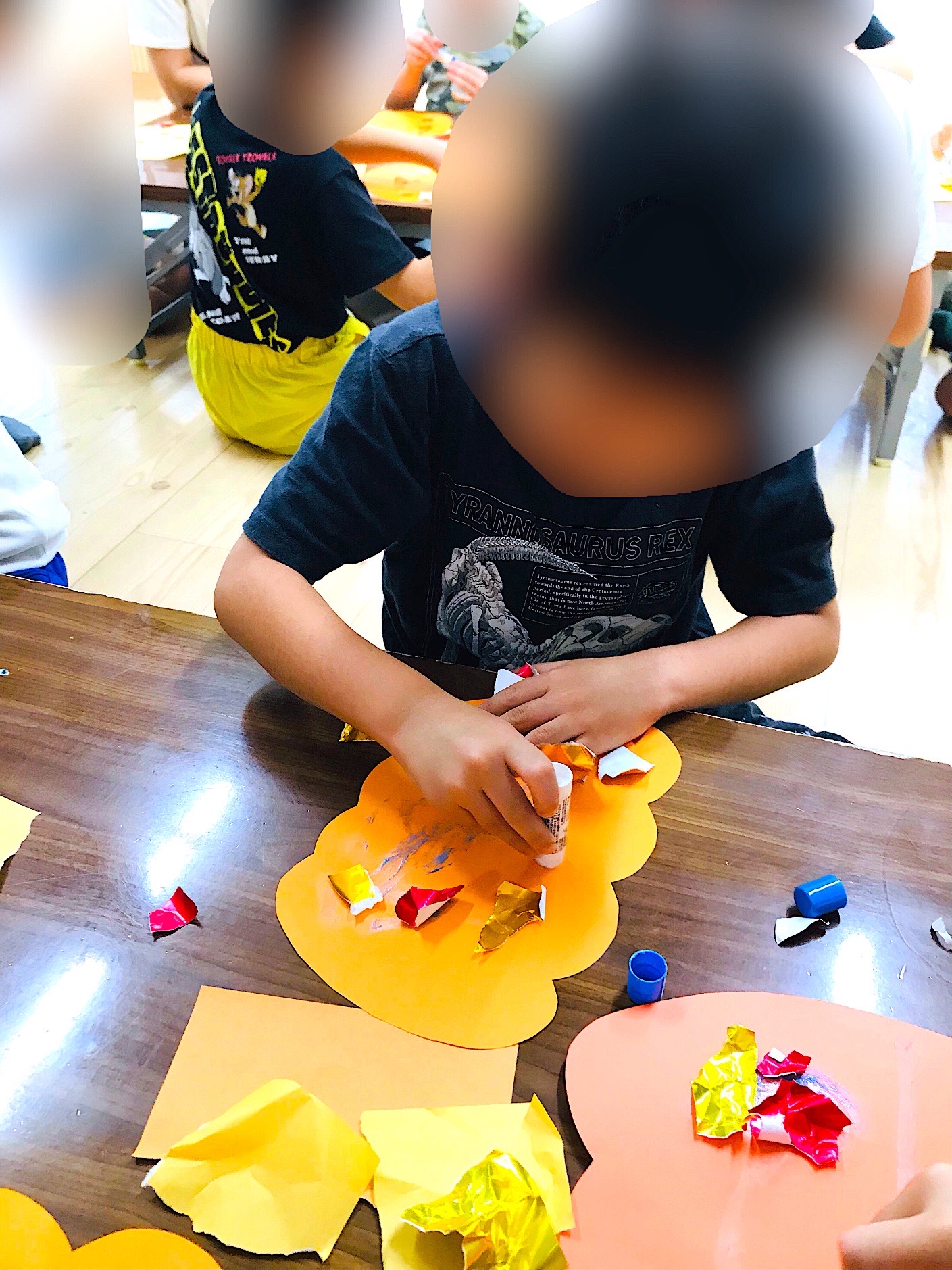 ③のり付け(カボチャ型に貼り絵をしていく)