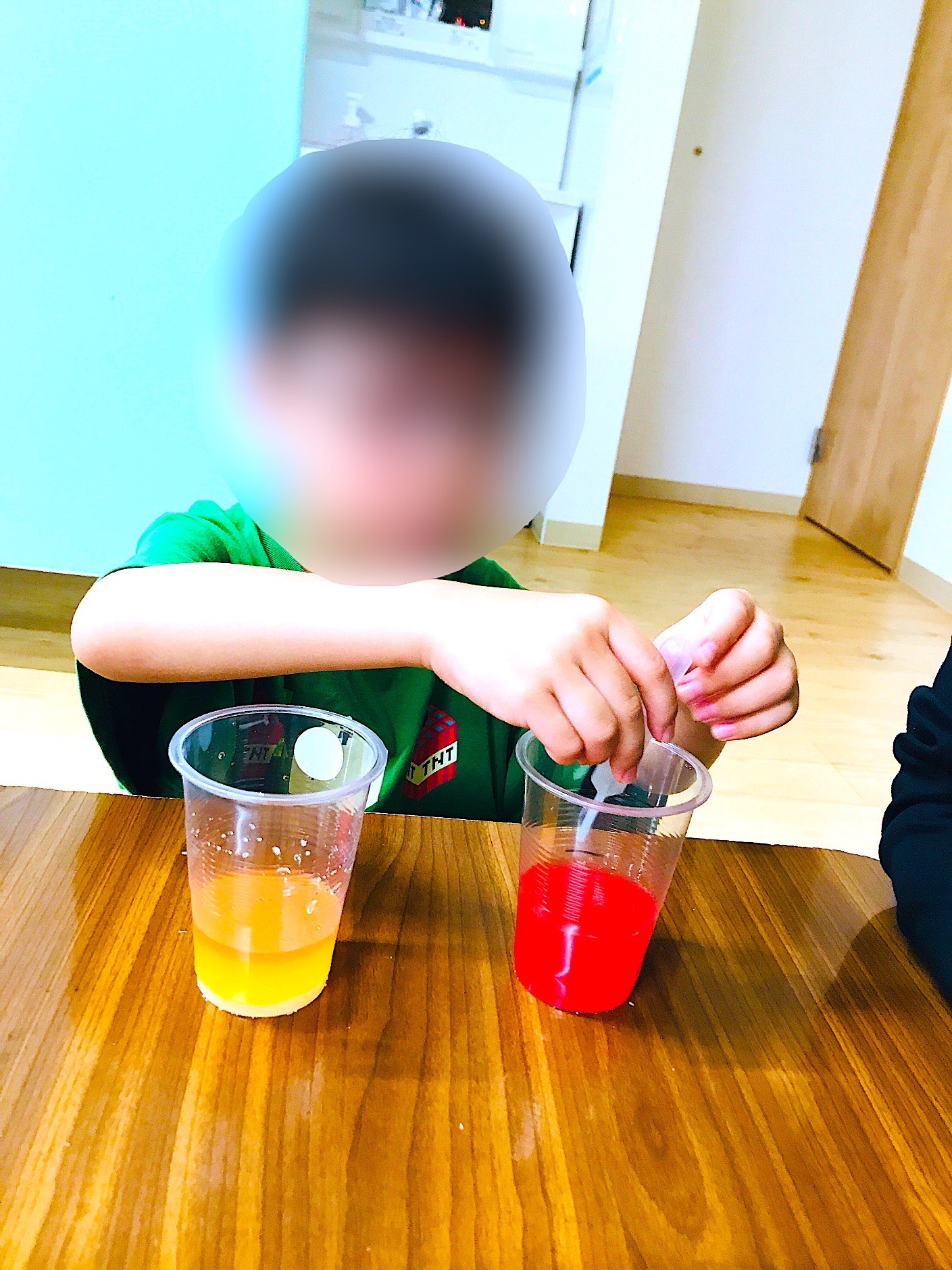 できあがった二層の色水を見て、